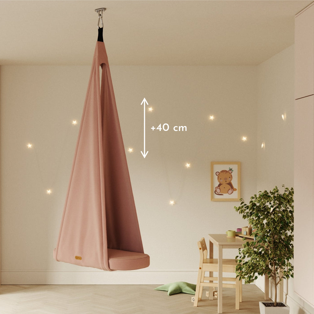 Die Play & Chill Schaukel ist für fast alle gängigen Deckenhöhen zwischen 2,20 m - 2,80 m geeignet. Durch den beiliegenden Verlängerungsgurt in 10 cm Abständen, kann die Länge der Schaukel um bis zu 40 cm vergrößert werden.